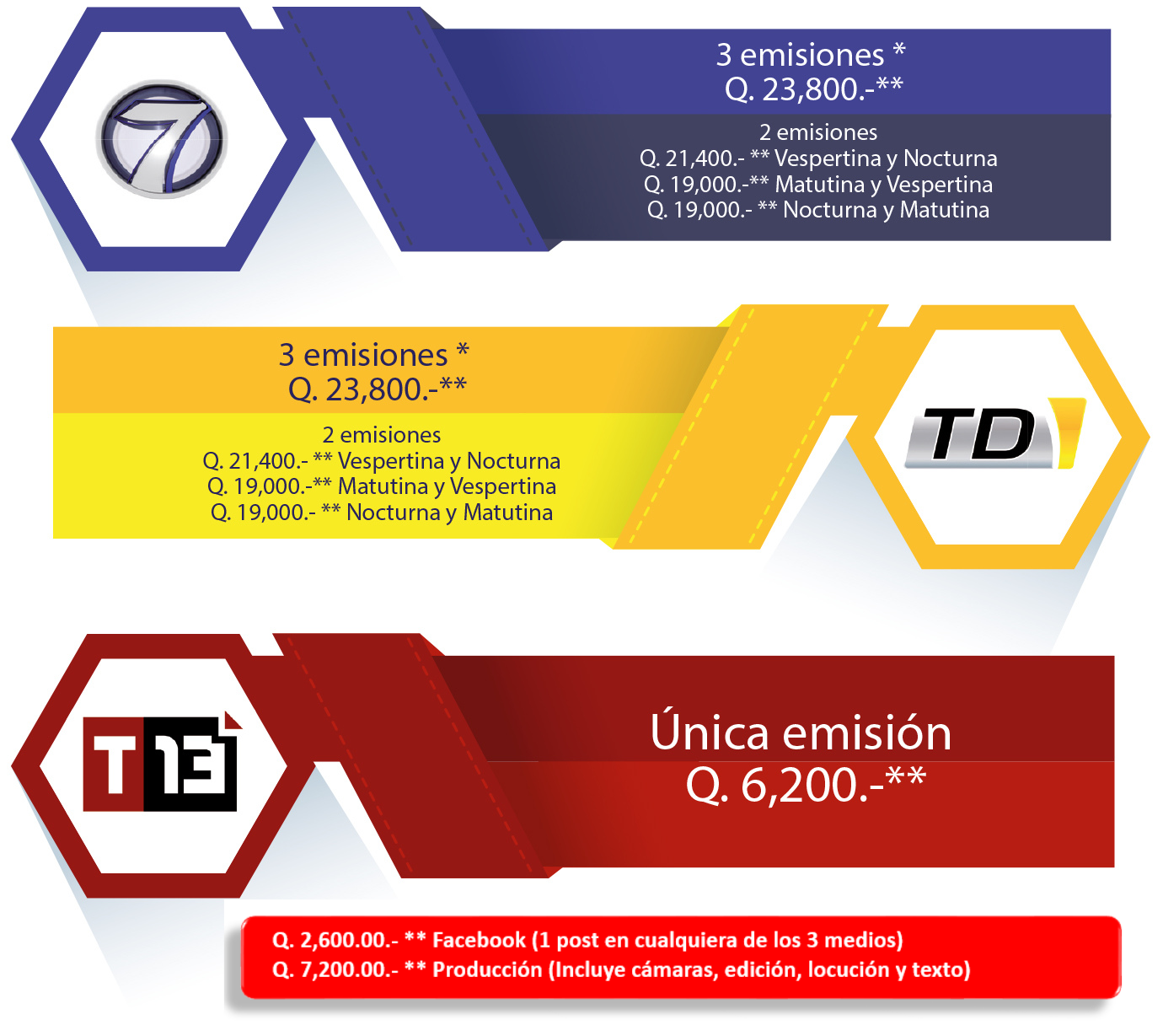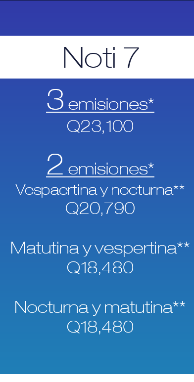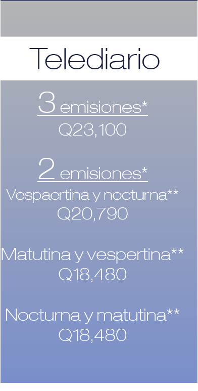 Producción: Q5,500 (Incluye cámaras, edición, locución y texto). * Emisiones consecutivas. ** Tarifas no incluyen impuestos.